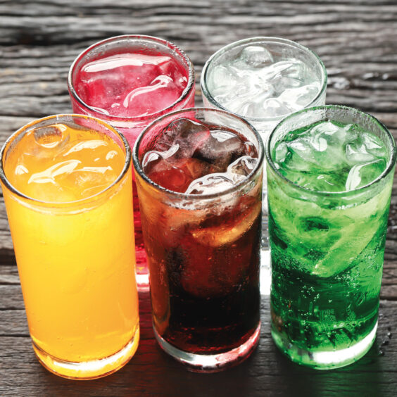 Carbonated beverage typically served chiled, available in various flavors such as cola, lemon-lime, or orange, offering a fizzy and refreshing drink option